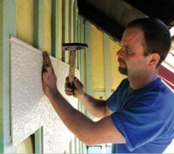 Man benötigt zur Verlegung der STRUWA-Fassadenplatte auf eine Unterkonstruktion (aus Holz oder Metall), lediglich einen Hammer und verzinkte Nägel. Die Platten lassen sich bedarfsgerecht mit einer Stichsäge oder einer Flex zurechtschneiden und können sogar auf Wunsch mit Acryl-Lack überstrichen werden.